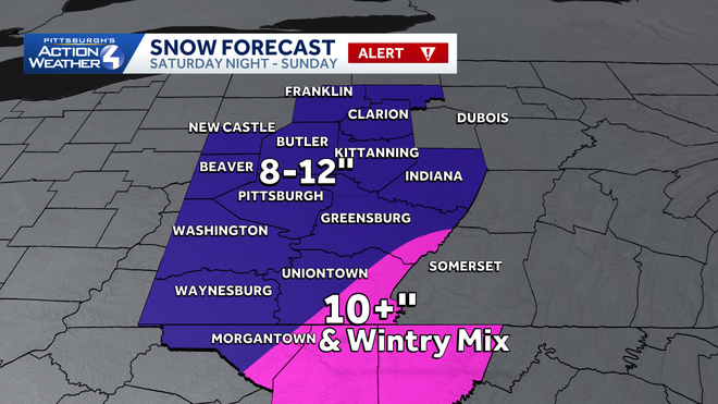 Frigid temperatures have already set in, and now a major swath of moisture is approaching from the southwest. This system is expected to bring double-digit snowfall totals to nearly all locations in the Pittsburgh media market, with an open question of how strong and how far north a tongue of warm air will be, bringing with it sleet and holding down snow totals.