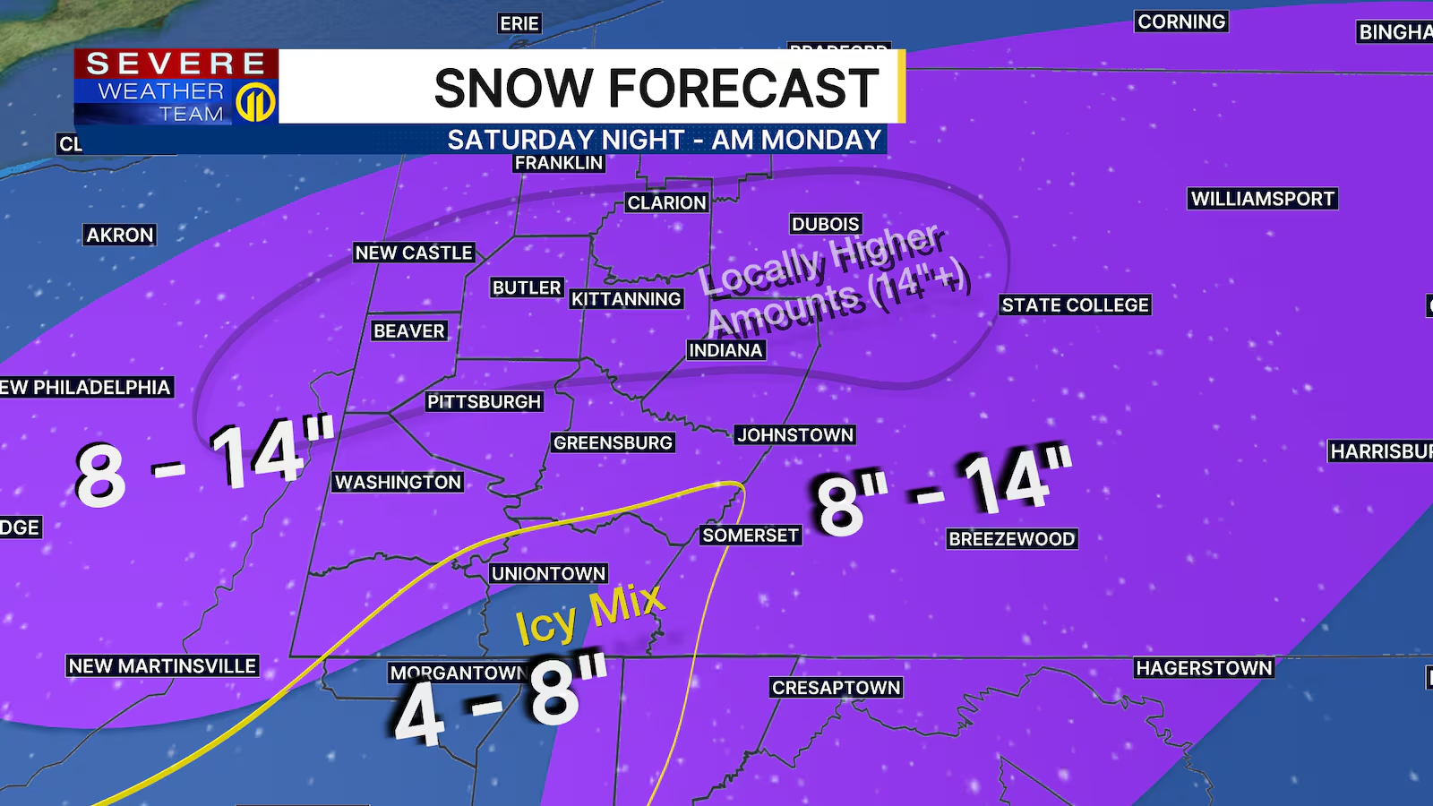 Frigid temperatures have already set in, and now a major swath of moisture is approaching from the southwest. This system is expected to bring double-digit snowfall totals to nearly all locations in the Pittsburgh media market, with an open question of how strong and how far north a tongue of warm air will be, bringing with it sleet and holding down snow totals.